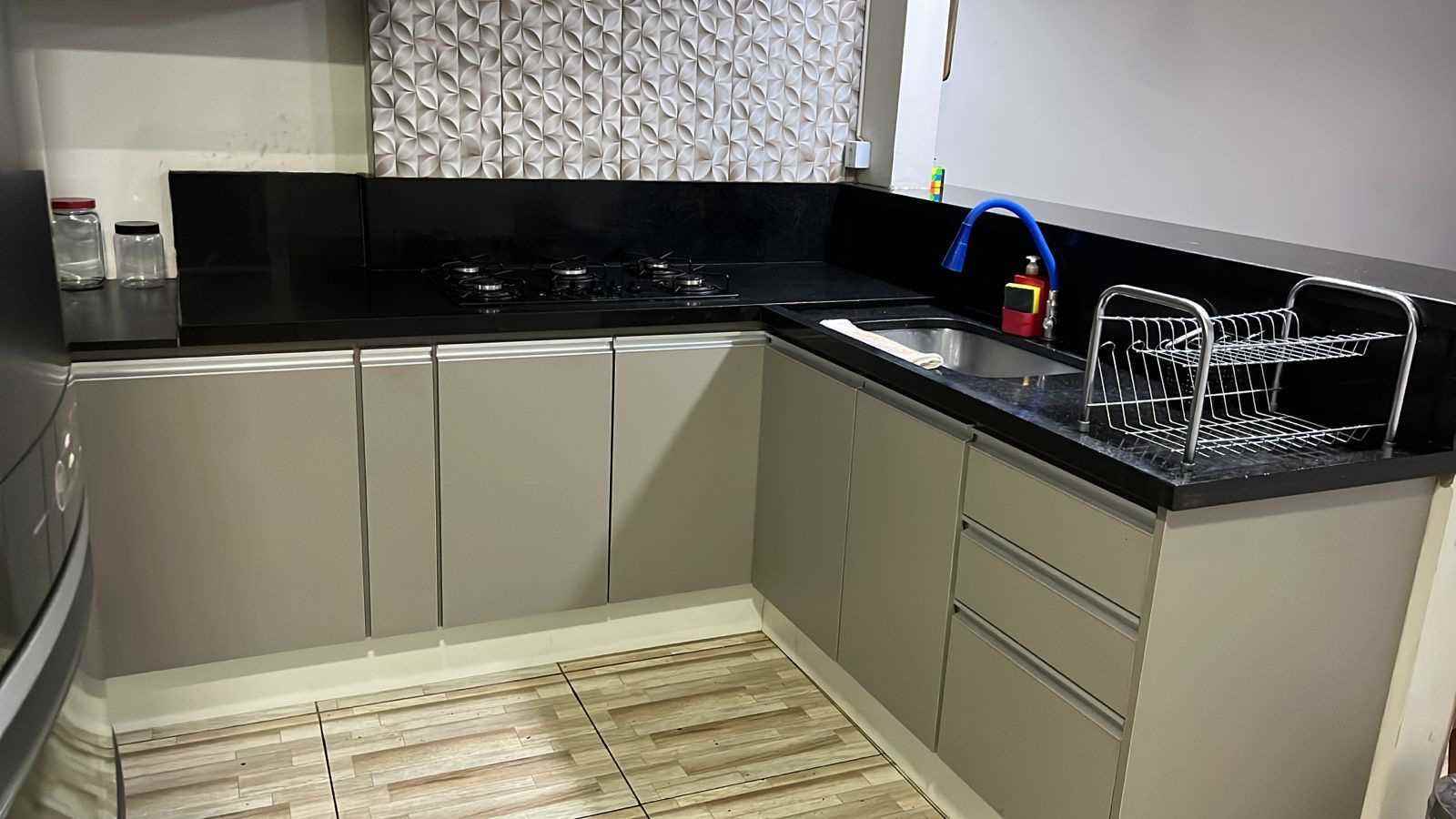 - Cozinha americana com armários planejados e cooktop